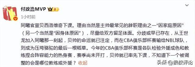 北京时间12月9日,根据南京同曦官方社媒公示,球队原主帅贝西洛维奇由于家庭原因主动辞职,原助教、前浙江队主帅王世龙接替成为球队新任主教练。 这将是贝西洛维奇第2次离开同曦帅位,贝帅第一次执教同曦是2020年,2021年下课;去年他再次加盟球队,先是助理教练,之后担任主帅。 媒体人付政浩发文点评:“同曦官宣贝西洛维奇下课,理由当然是主帅最常见的辞职理由之一“因家庭原因”(另一个当然是“因身体原因”),尽量给双方留足体面。 分歧或早已存在,从王世龙加入同曦那一刻起,贝帅的命运就已注定,而在CBA俱乐部杯赛输给NBL球队,则成为压垮骆驼的最后一根稻草。 今年的CBA俱乐部杯赛是各队检验外援成色和教练捏合阵容能力的热身赛,赛季尚未开打,贝帅就已率先下课,不知道下一个被调整的会是哪位教练或外援?” 篮球记者贾磊发文点评:“没想到新赛季还没开始,就已经有球队主教练下课了,这赛季竞争可真够激烈的啊。 ” 有知情媒体曝出更多细节表示:同曦在本次CBA俱乐部杯赛事成绩糟糕(0胜2负),管理层与贝帅沟通,并希望后者拿出问题解决办法。但贝帅表示他已经对球队失控,部分球员已经不听从自己的战术安排。 贝帅要求对个别球员进行裁员,以树立其在球队的威信。但这样的解决方法并不能令球队管理层感到满意。双方再次沟通,贝帅仍然没有拿出有效的解决问题方法,这也成为压死骆驼的最后一根稻草。 值得一提的是,同曦在9日早晨通知了各个球员,球队进行换帅的决定。 有球迷点评说道:“带队历史第一次进季后赛,打了一个杯赛就回家了”,这样的决定是否过于儿戏了。 |