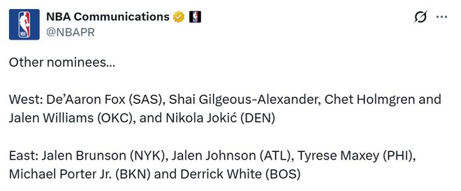 西部:福克斯(马刺)、亚历山大、霍姆格伦、杰伦-威廉姆斯(雷霆)、约基奇(掘金) 东部:布伦森(尼克斯)、约翰逊(老鹰)、马克西(76人)、小波特(篮网)、怀特(凯尔特人) |