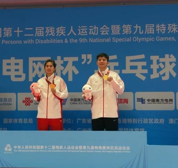 12月9日,在全国第十二届残疾人运动会暨第九届特殊奥林匹克运动会乒乓球XD13混合双打金牌赛中,来自广西的罗振邦、黄梦萍这对“夫妻档”组合以3比1战胜山东队的王聪、王哲,历史性地摘得金牌。比赛结束后,夫妻两人紧紧相拥。