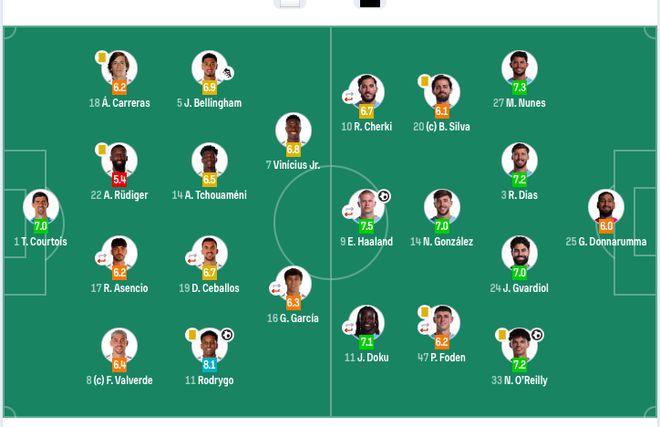 【出场阵容】 皇马首发:1-库尔图瓦、8-巴尔韦德、17-阿森西奥、22-吕迪格、18-卡雷拉斯、14-琼阿梅尼、19-塞巴略斯、5-贝林厄姆、11-罗德里戈、16-贡萨洛、7-维尼修斯。 皇马替补:13-卢宁、26-弗兰·冈萨雷斯、9-恩德里克、10-姆巴佩、15-居莱尔、20-弗兰·加西亚、21-迪亚斯、28-塞斯特罗、30-马斯坦托诺、36-约安·马丁内斯、40-巴尔德佩尼亚斯。 曼城首发:25-多纳鲁马、27-努内斯、3-迪亚斯、24-格瓦迪奥尔、33-奥赖利、14-尼科·冈萨雷斯、20-B席、47-福登、10-谢尔基、11-多库、9-哈兰德。 曼城替补:1-特拉福德、13-贝蒂内利、4-赖因德斯、6-阿克、7-马尔穆什、21-努里、26-萨维尼奥、45-胡桑诺夫、52-鲍勃、82-刘易斯。 |