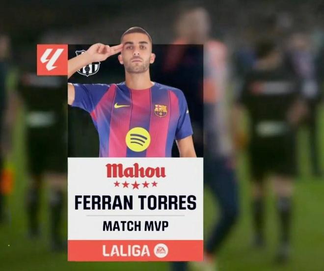 西甲第15轮,巴塞罗那客场5-3击败皇家贝蒂斯,此役上演帽子戏法的费兰-托雷斯当选西甲官方全场最佳球员。
