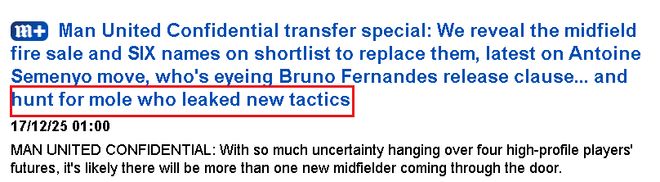 英国《每日邮报》称,鲁本·阿莫林对赛前英媒便知晓自己有意改变343阵型的消息感到意外,他在赛前采访中就被追问变阵的问题。 而曼联备战期间一直对球队信息保密,甚至拒绝公布非洲杯国脚的去留结果,就是为了迷惑伯恩茅斯。没想到,却有人泄密。 曼联俱乐部亦对马兹拉维无法参加那场比赛感到失望,俱乐部本希望他打完与伯恩茅斯之战才离队,然而摩洛哥12月21日本周日就要踢非洲杯第一场比赛,故此拒绝了马兹拉维参赛的申请。当然,他们非常公平,也没让国脚参加皇家贝蒂斯周一的西甲联赛。 对此,曼联无法抗辩,俱乐部曾上报国际足联,但FIFA认为摩洛哥足协只是照章办事,前往参赛的球员应该在首场比赛前7天获准离队。红魔只能埋怨英超的赛程安排,如果比赛安排在周六日,就不会有这样的争议。