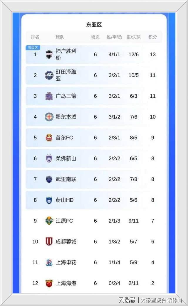 神户胜利船以13分高居榜首,主场战胜申花之后,广岛三箭积分来到11分,跻身三甲行列。